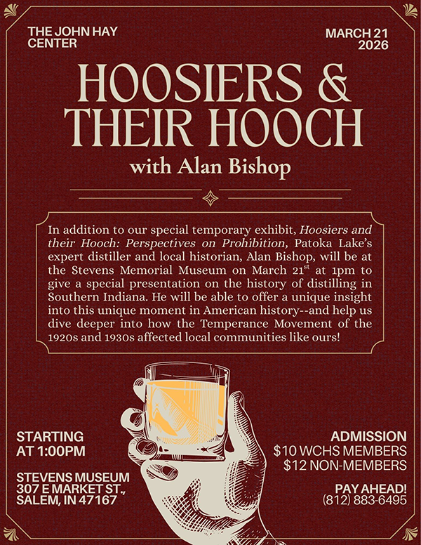 Supplemental program to go along with our temporary exhibit. Patoka Lake’s Master Distiller Alan Bishop will be visiting us at The Stevens Memorial Museum Basement to give a prevention on the history of distilling in Southern Indiana. He will be able to provide a unique insight in how Prohibition effected small communities like ours.